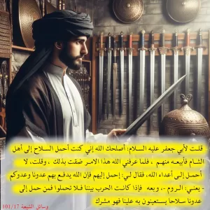 وعنهم، عن أحمد بن محمد, عن ابن محبوب، عن علي ابن الحسن بن رباط ، عن أبي سارة، عن هند السراج قال: قلت لأبي جعفر عليه السلام: أصلحك الله إني كنت أحمل السلاح إلى أهل الشام فأبيعه منهم ، فلما عرفني الله هذا الامر ضقت بذلك ، وقلت، لا أحمل إلى أعداء الله، فقال لي: إحمل إليهم فإن الله يدفع بهم عدونا وعدوكم – يعني: الروم -، وبعه فإذا كانت الحرب بيننا فلا تحملوا فمن حمل إلى عدونا سلاحا يستعينون به علينا فهو مشرك