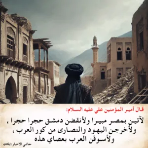 حدثنا محمد بن الحسن قال : حدثنا محمد بن الحسن الصفار. قال : حدثنا أحمد بن محمد ، عن عثمان بن عيسى عن صالح بن ميثم ، عن عباية الأسدي ، قال : سمعت أمير المؤمنين عليهالسلام يقول: لآتين بمصر مبيرا ولأنقضن دمشق حجرا حجرا ، ولأخرجن اليهود والنصارى من [ كل ] كور العرب ، ولأسوقن العرب بعصاي هذه
